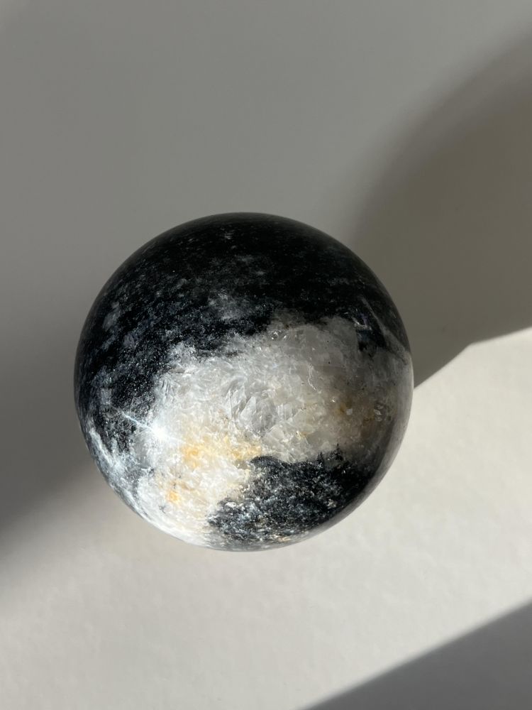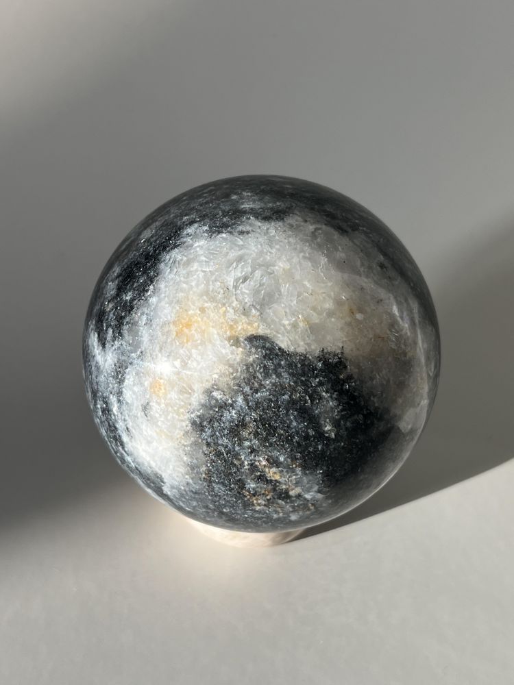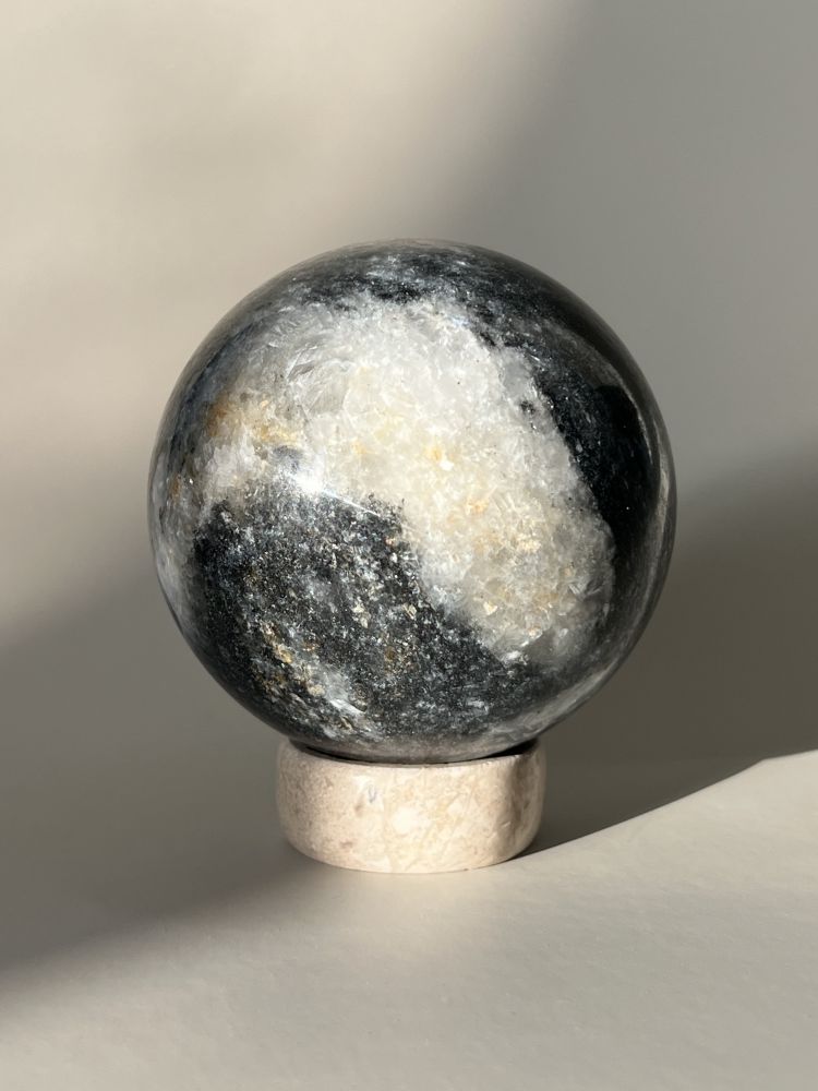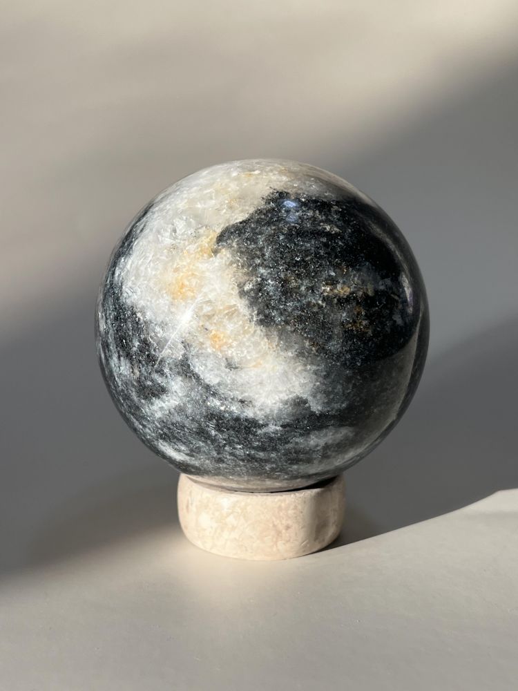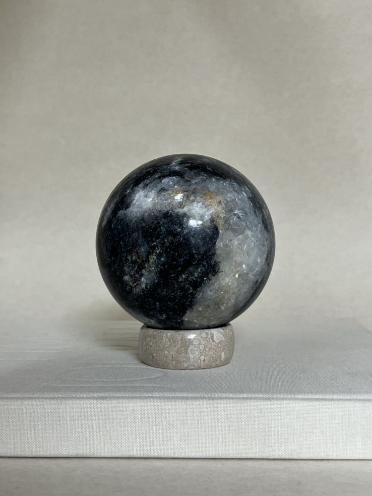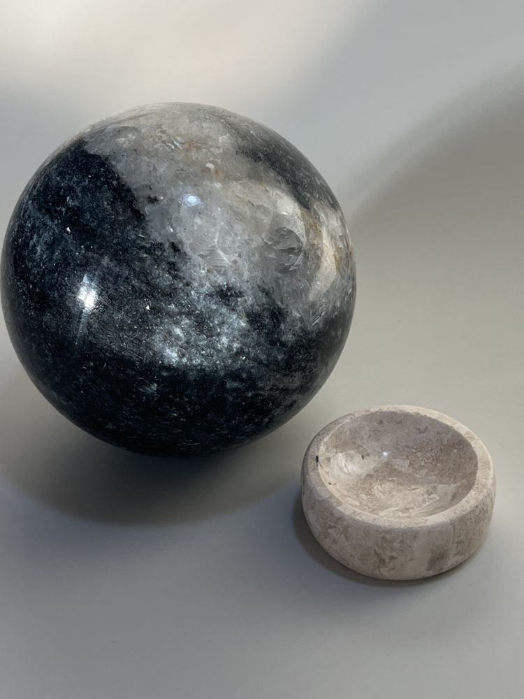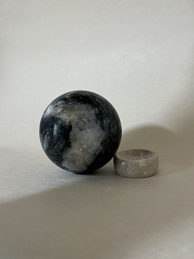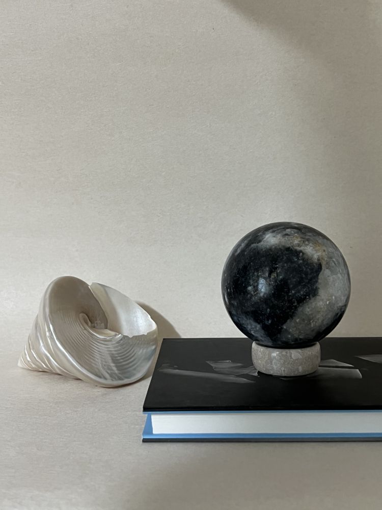 섬세하게 세공된 스피어 형태의 오브제입니다. 무게감있는 스피어를 손으로 조각한 배색 스탠드에 올려서 연출 할 수 있습니다. 천연 대리석만의 오묘한 결정, 비정형적 패턴들이 아름답게 담겨 공간에 예술적 무드를 더해줍니다.